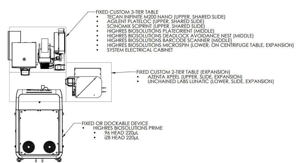 - HighRes’ Prime Liquid Handler includes storage and integrated robotic arm to allow for a compact yet scalable layout that supports simultaneous runs and on-deck buffering of consumables and samples.